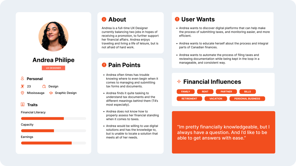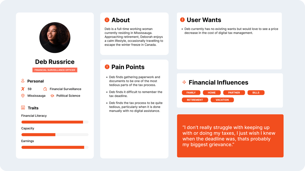 To understand the difference in lived experiences from different Canadians, I concluded that talking with them face-to-face in an interview format would make the most sense. Speaking to them in this way helped them naturally talk about their experiences with Canadian taxes, both positive and negative. Through these discussions, I was able to identify a few commonalities between each user's responses, ultimately allowing me to centralize the following pain points during this project:
