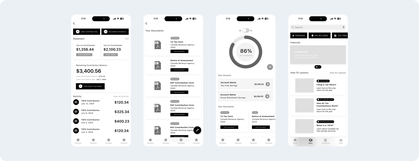 I referenced Scotiabank, Wealthsimple, and EQ Bank for their clean design, intuitive navigation, and simplicity, using them as inspiration to inform my design decisions as they are similar in nature/industry.