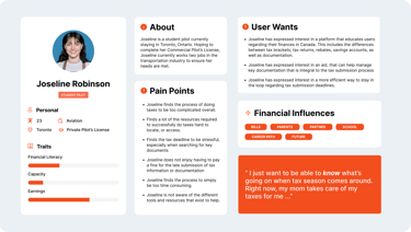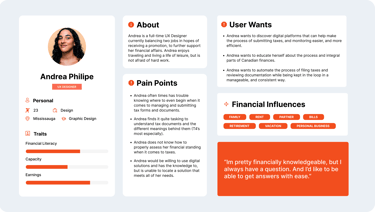 After reviewing and synthesizing my user interview notes, clear patterns began to emerge. These insights helped shape three personas, each representing different levels of experience with taxes and differing needs, goals, and priorities.