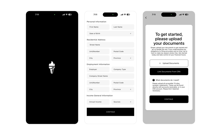 Onboarding was intentionally designed to feel supportive rather than intimidating. Instead of asking users for everything at once, information is collected gradually and paired with clear explanations around why each step is needed. Giving users the option to upload documents early or link directly with the CRA helps reduce uncertainty and builds confidence right from the beginning.