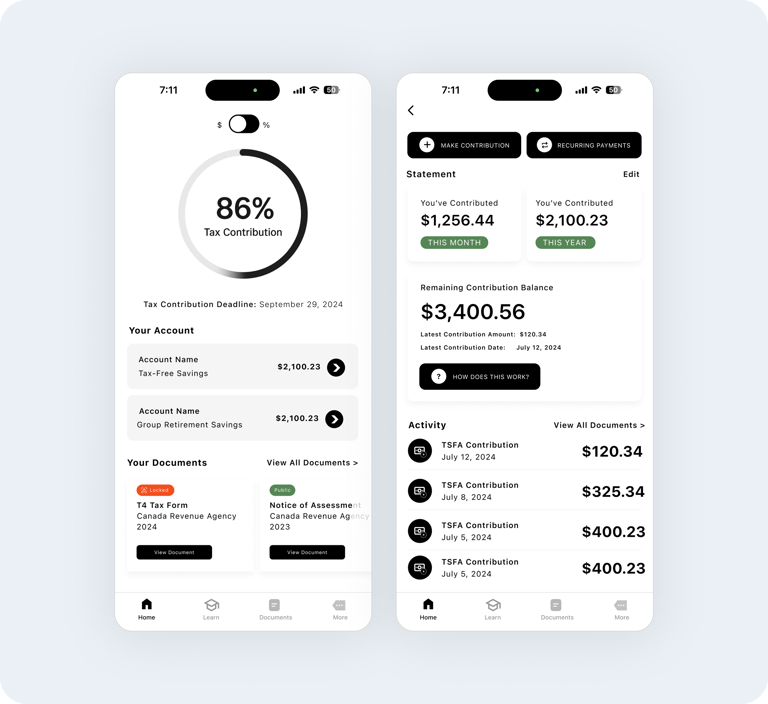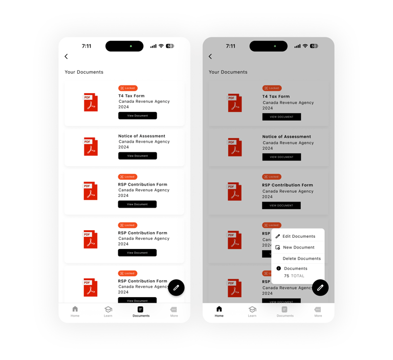 The Document Manager gives users a single space to store, view, and manage all tax-related documents in one place. Important forms such as T4s, Notices of Assessment, and contribution records are clearly labeled and organized, allowing users to quickly understand what documents they have on file and access them when needed.
